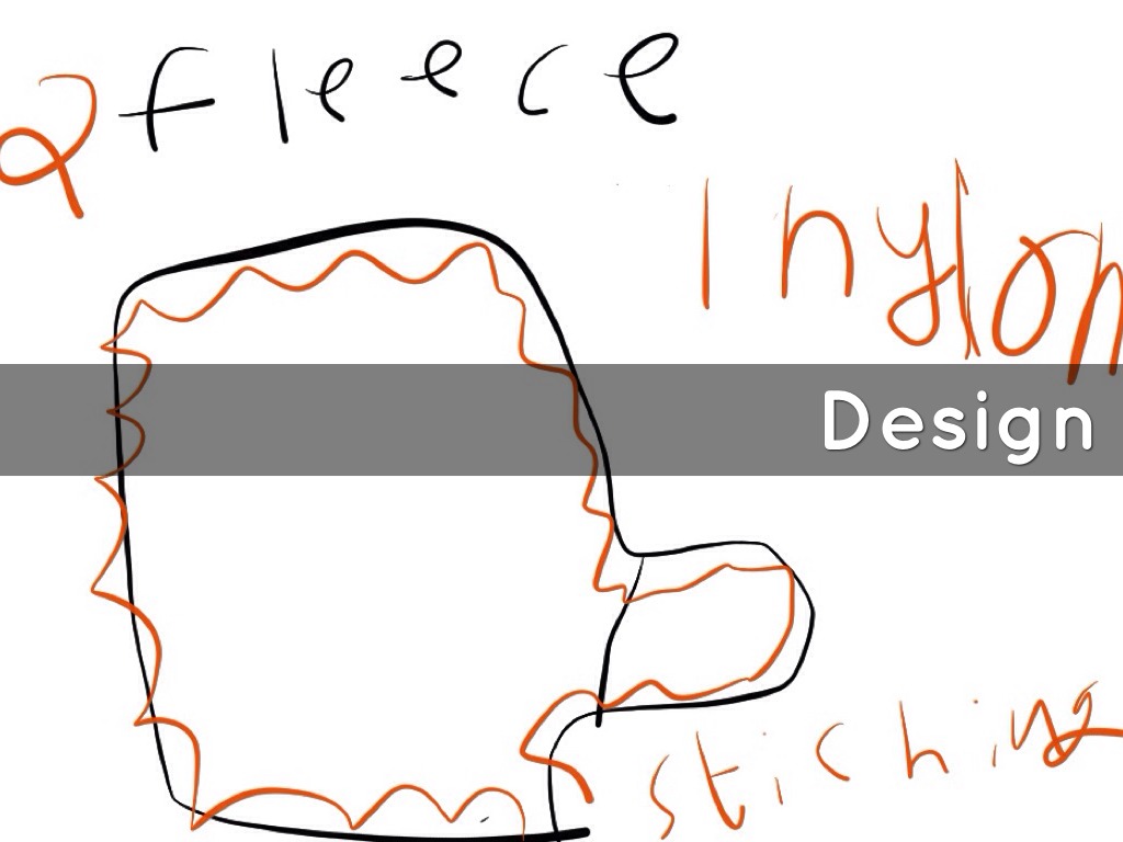 Design I am going to use fleece and nylon. Fleece is soft and warm, and nylon is water resistant. There will be 2 layers of fleece and 1 layer of nylon.