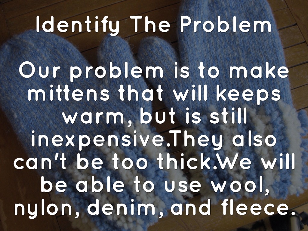 Our problem is to make mittens that will keeps warm, but is still inexpensive.They also can't be too thick.We will be able to use wool, nylon, denim, and fleece.