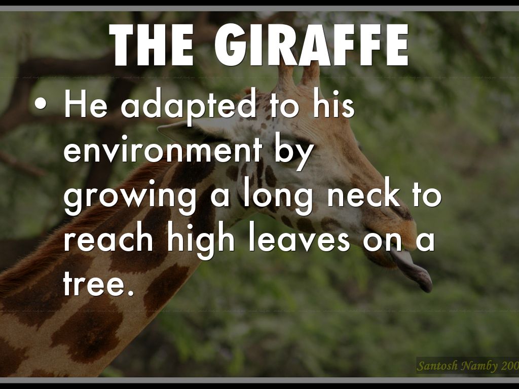 He adapted to his environment by growing a long neck to reach high leaves on a tree.