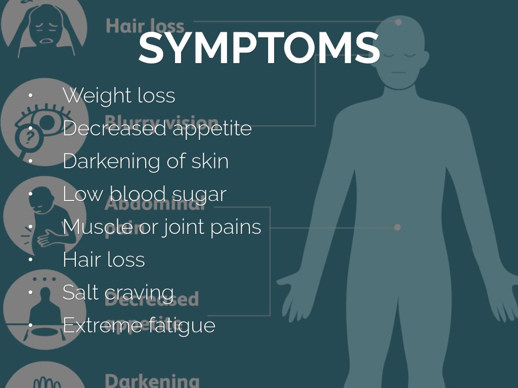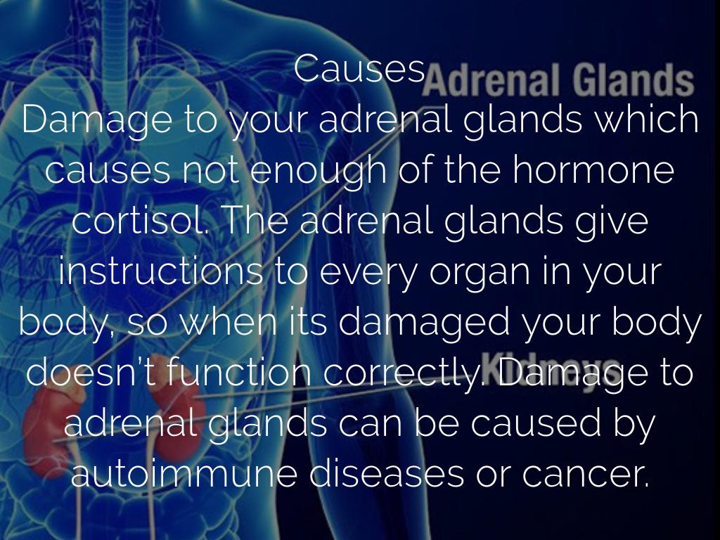 Damage to your adrenal glands which causes not enough of the hormone cortisol. The adrenal glands give instructions to every organ in your body, so when its damaged your body doesn’t function correctly. Damage to adrenal glands can be caused by autoimmune diseases or cancer.