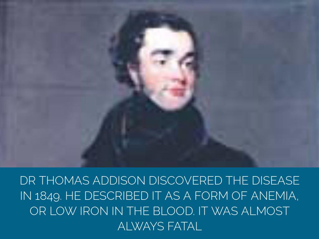DR THOMAS ADDISON DISCOVERED THE DISEASE IN 1849. HE DESCRIBED IT AS A FORM OF ANEMIA, OR LOW IRON IN THE BLOOD. IT WAS ALMOST ALWAYS FATAL