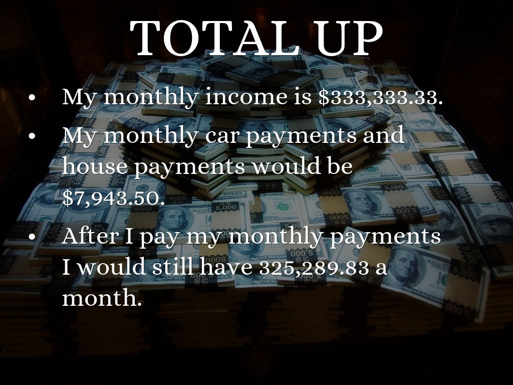 After I pay my monthly payments I would still have 325,289.83 a month.