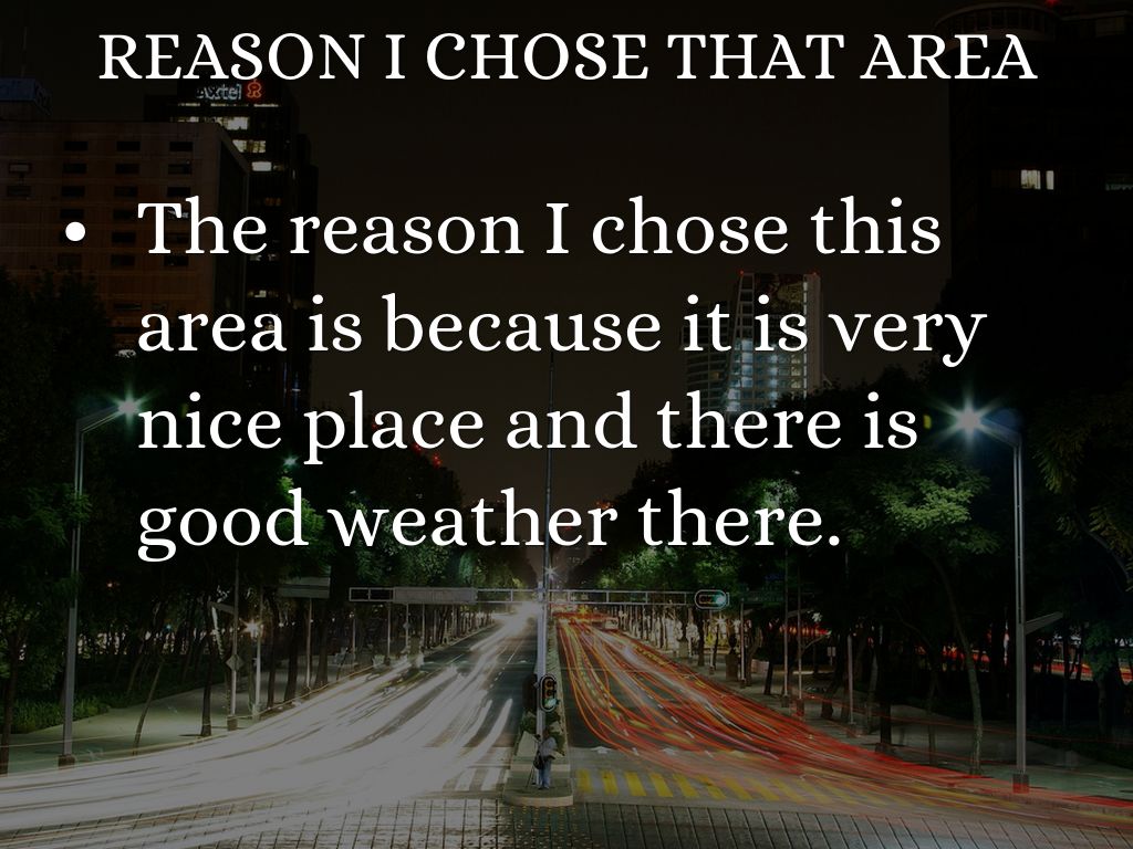 The reason I chose this area is because it is very nice place and there is good weather there.