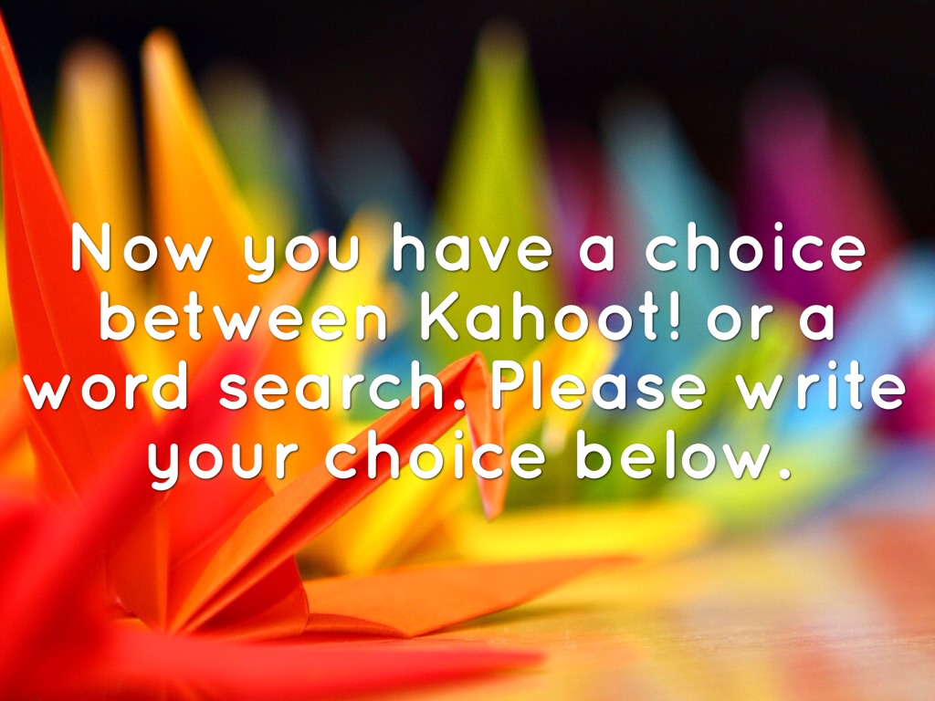 Now you have a choice between Kahoot! or a word search. Please write your choice below.