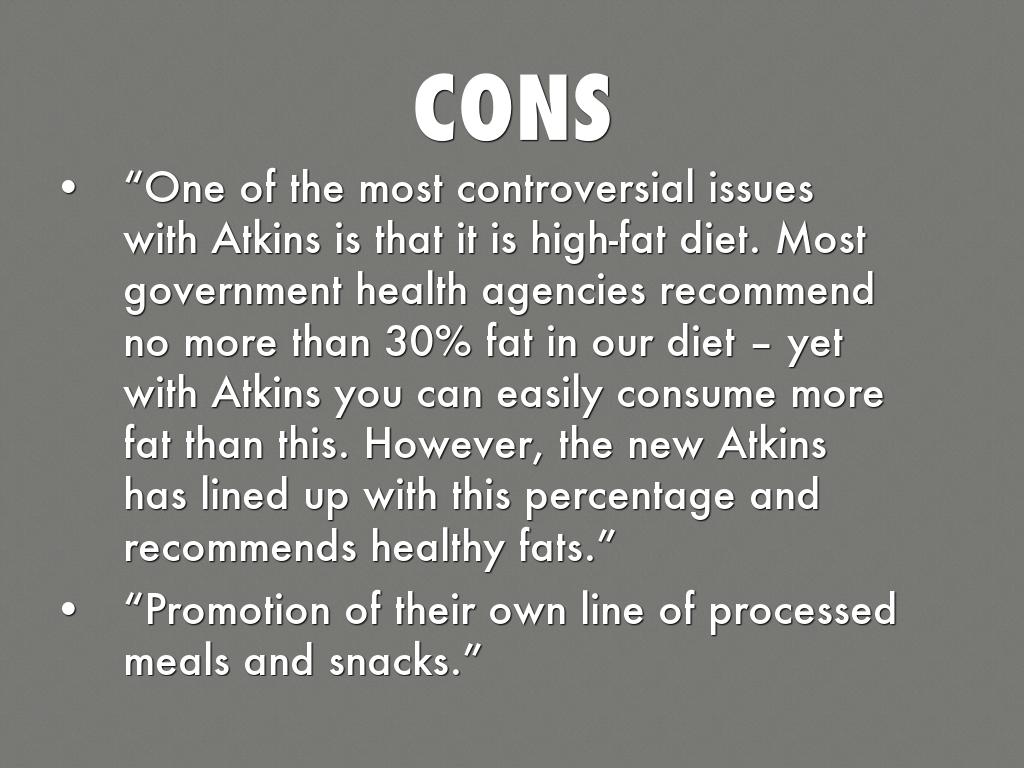 - “One of the most controversial issues with Atkins is that it is high-fat diet. Most government health agencies recommend no more than 30% fat in our diet – yet with Atkins you can easily consume more fat than this. However, the new Atkins has lined up with this percentage and recommends healthy fats.”