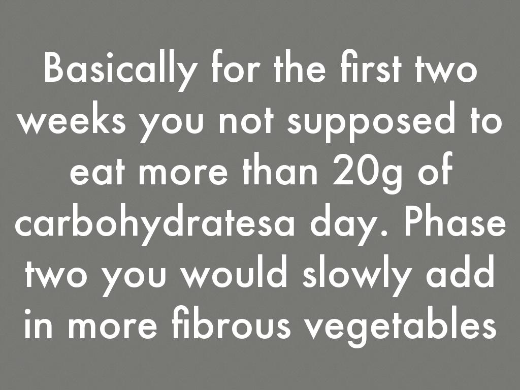 Basically for the first two weeks you not supposed to eat more than 20g of carbohydratesa day. Phase two you would slowly add in more fibrous vegetables