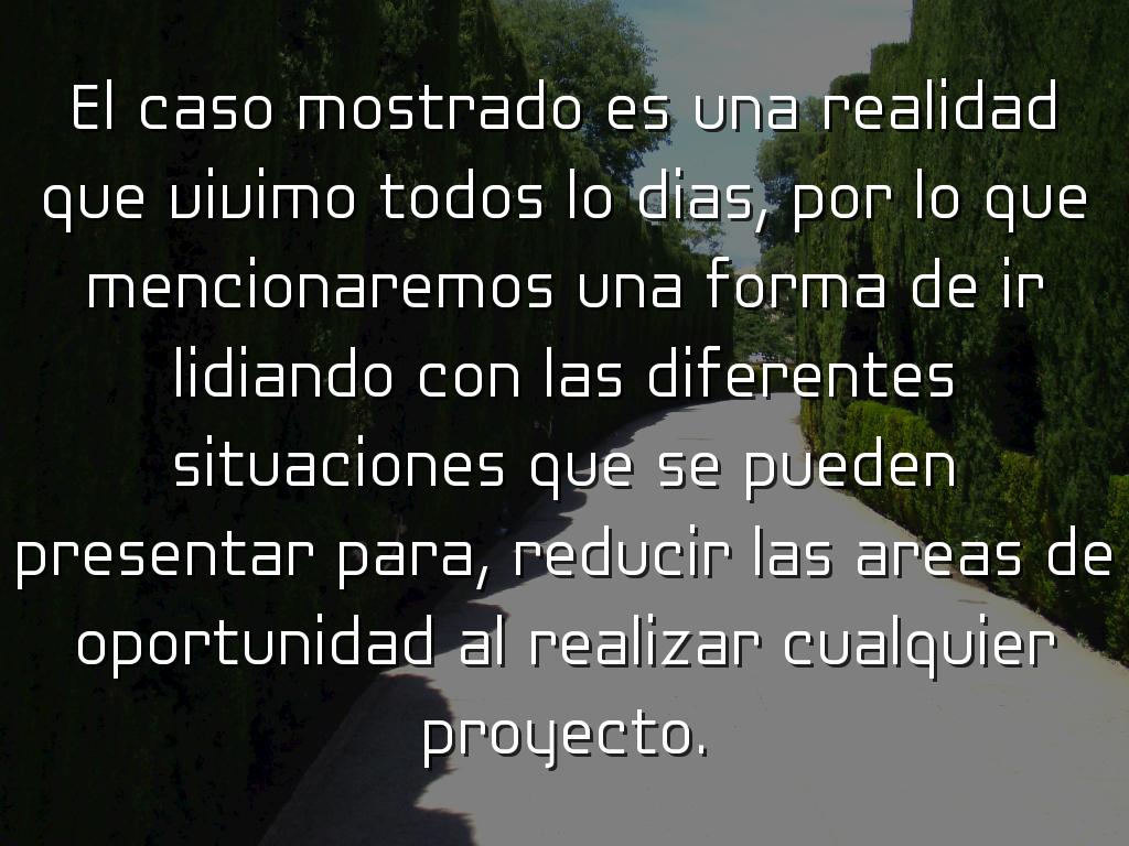 El caso mostrado es una realidad que vivimo todos lo dias, por lo que mencionaremos una forma de ir lidiando con las diferentes situaciones que se pueden presentar para, reducir las areas de oportunidad al realizar cualquier proyecto.