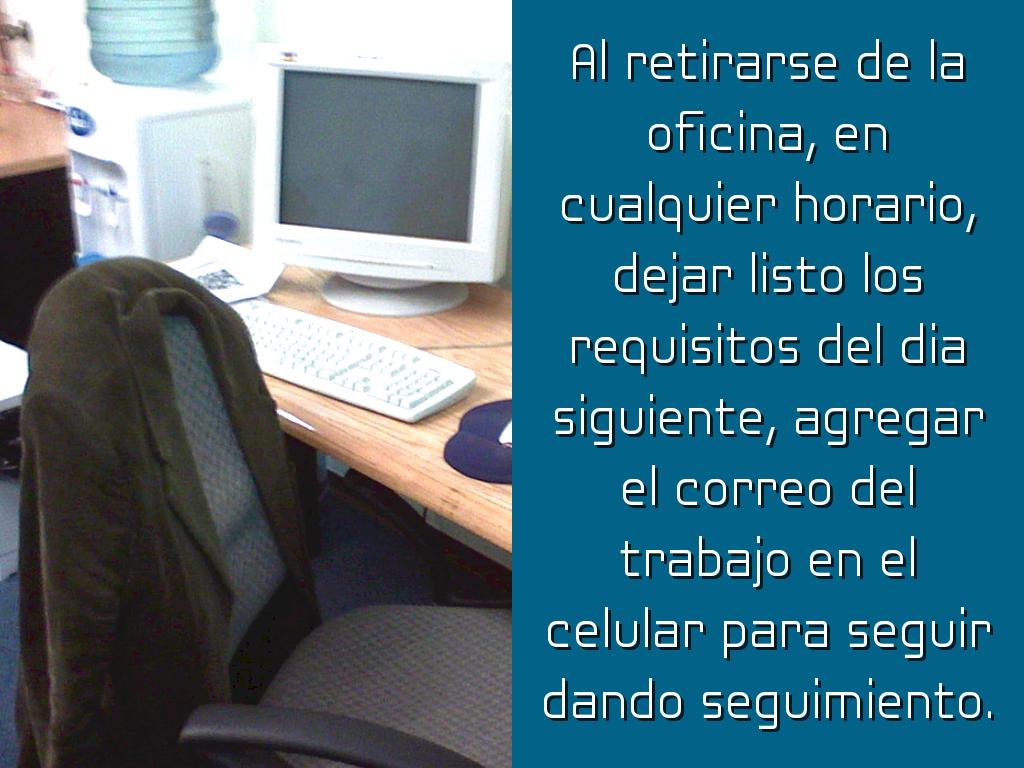 Al retirarse de la oficina, en cualquier horario, dejar listo los requisitos del dia siguiente, agregar el correo del trabajo en el celular para seguir dando seguimiento.