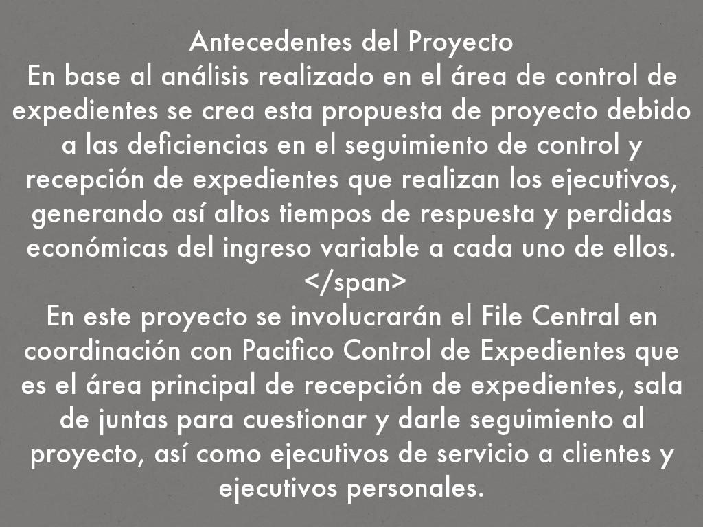 En base al análisis realizado en el área de control de expedientes se crea esta propuesta de proyecto debido a las deficiencias en el seguimiento de control y recepción de expedientes que realizan los ejecutivos, generando así altos tiempos de respuesta y perdidas económicas del ingreso variable a cada uno de ellos.