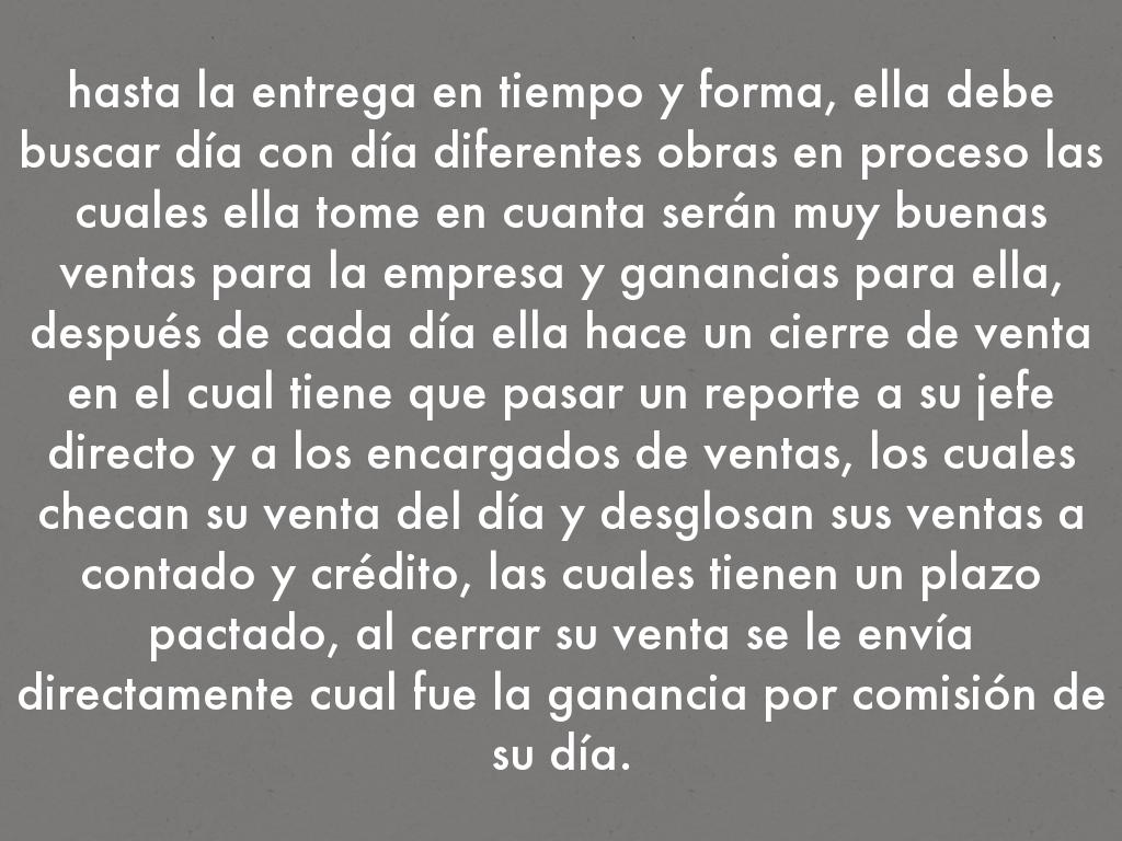 hasta la entrega en tiempo y forma, ella debe buscar día con día diferentes obras en proceso las cuales ella tome en cuanta serán muy buenas ventas para la empresa y ganancias para ella, después de cada día ella hace un cierre de venta en el cual tiene que pasar un reporte a su jefe directo y a los encargados de ventas, los cuales checan su venta del día y desglosan sus ventas a contado y crédito, las cuales tienen un plazo pactado, al cerrar su venta se le envía directamente cual fue la ganancia por comisión de su día.