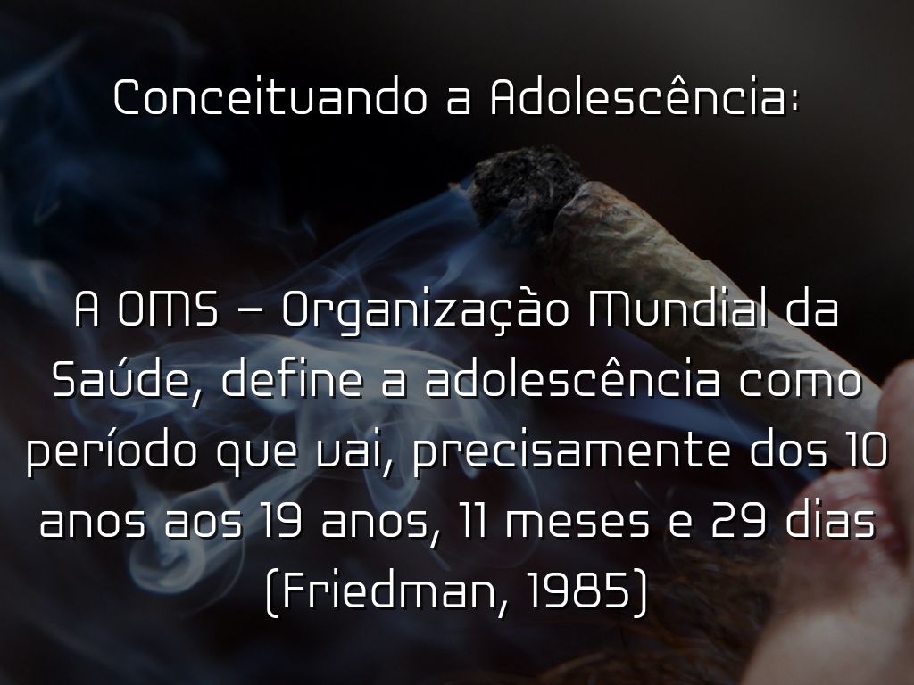 A OMS – Organização Mundial da Saúde, define a adolescência como período que vai, precisamente dos 10 anos aos 19 anos, 11 meses e 29 dias (Friedman, 1985)