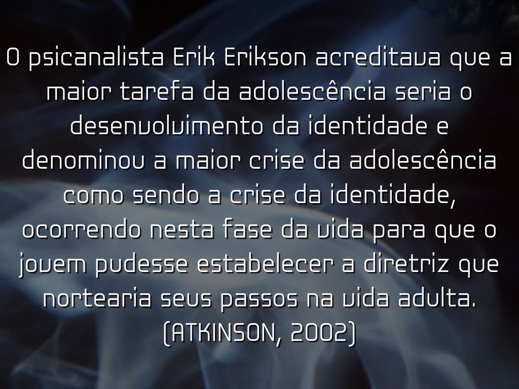 O psicanalista Erik Erikson acreditava que a maior tarefa da adolescência seria o desenvolvimento da identidade e denominou a maior crise da adolescência como sendo a crise da identidade, ocorrendo nesta fase da vida para que o jovem pudesse estabelecer a diretriz que nortearia seus passos na vida adulta. (ATKINSON, 2002)