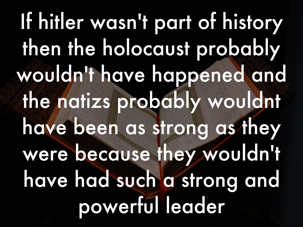 If hitler wasn't part of history then the holocaust probably wouldn't have happened and the natizs probably wouldnt have been as strong as they were because they wouldn't have had such a strong and powerful leader