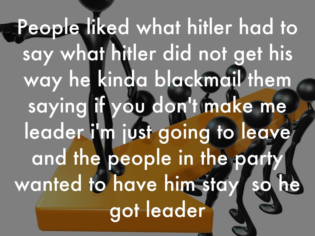 People liked what hitler had to say what hitler did not get his way he kinda blackmail them saying if you don't make me leader i'm just going to leave and the people in the party wanted to have him stay so he got leader