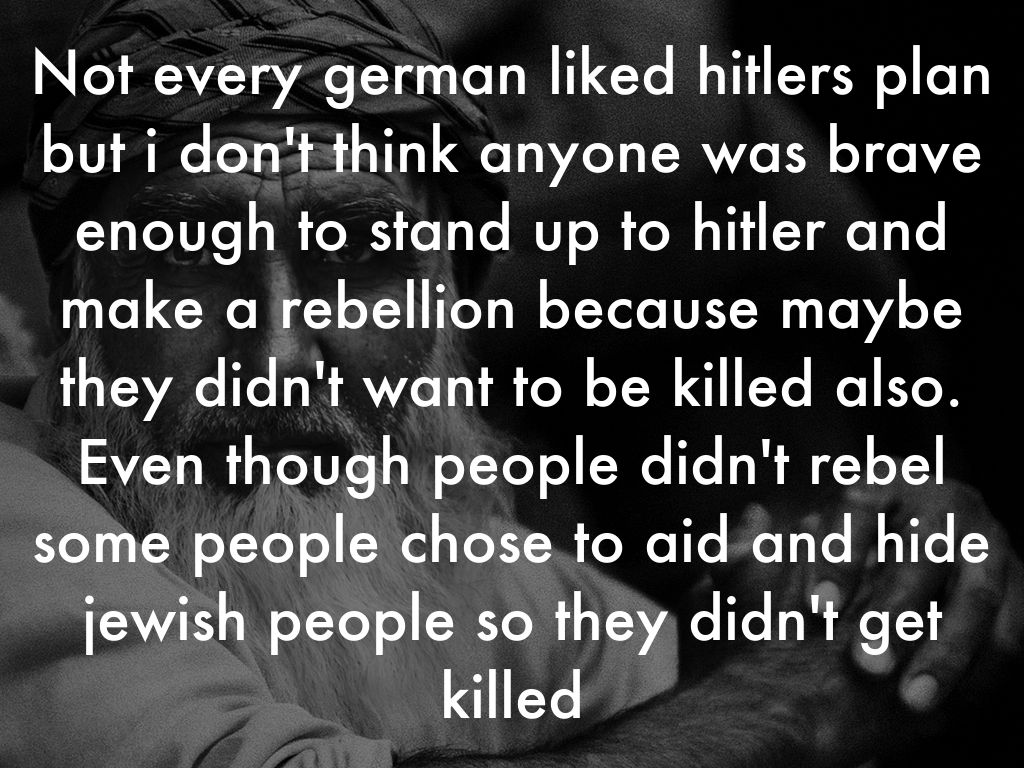 Not every german liked hitlers plan but i don't think anyone was brave enough to stand up to hitler and make a rebellion because maybe they didn't want to be killed also. Even though people didn't rebel some people chose to aid and hide jewish people so they didn't get killed