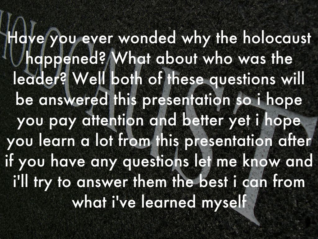 Have you ever wonded why the holocaust happened? What about who was the leader? Well both of these questions will be answered this presentation so i hope you pay attention and better yet i hope you learn a lot from this presentation after if you have any questions let me know and i'll try to answer them the best i can from what i've learned myself