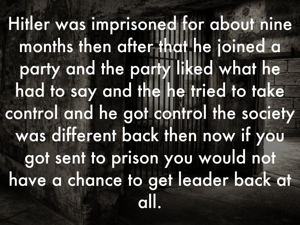 Hitler was imprisoned for about nine months then after that he joined a party and the party liked what he had to say and the he tried to take control and he got control the society was different back then now if you got sent to prison you would not have a chance to get leader back at all.