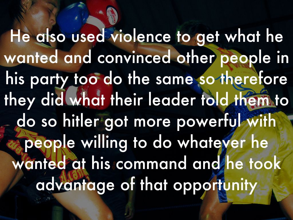 He also used violence to get what he wanted and convinced other people in his party too do the same so therefore they did what their leader told them to do so hitler got more powerful with people willing to do whatever he wanted at his command and he took advantage of that opportunity