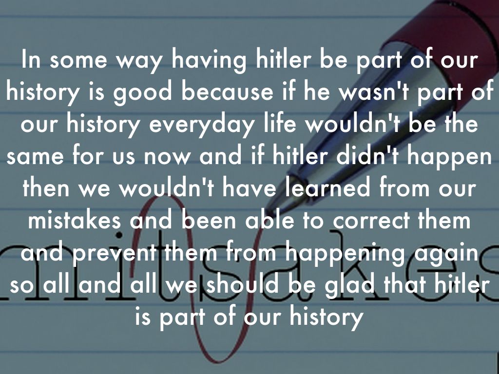 In some way having hitler be part of our history is good because if he wasn't part of our history everyday life wouldn't be the same for us now and if hitler didn't happen then we wouldn't have learned from our mistakes and been able to correct them and prevent them from happening again so all and all we should be glad that hitler is part of our history