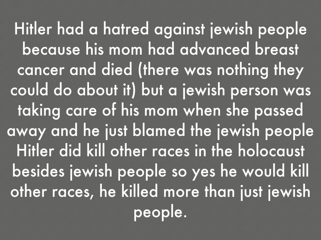 Hitler had a hatred against jewish people because his mom had advanced breast cancer and died (there was nothing they could do about it) but a jewish person was taking care of his mom when she passed away and he just blamed the jewish people