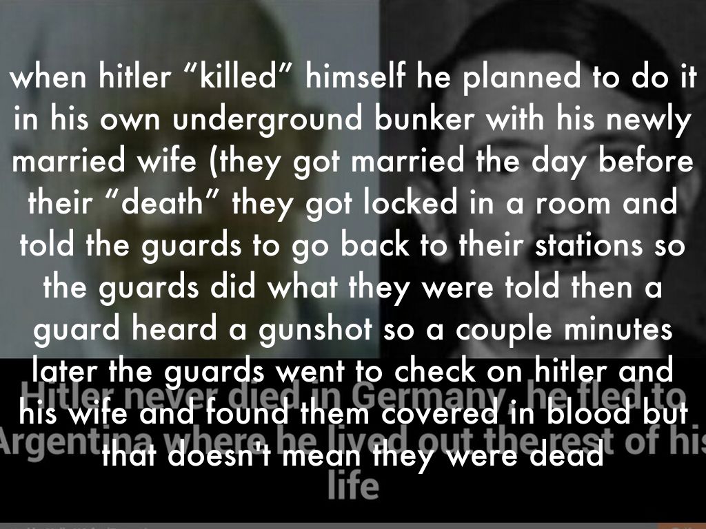 when hitler “killed” himself he planned to do it in his own underground bunker with his newly married wife (they got married the day before their “death” they got locked in a room and told the guards to go back to their stations so the guards did what they were told then a guard heard a gunshot so a couple minutes later the guards went to check on hitler and his wife and found them covered in blood but that doesn't mean they were dead
