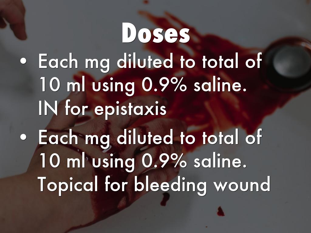 - Each mg diluted to total of 10 ml using 0.9% saline. Topical for bleeding wound