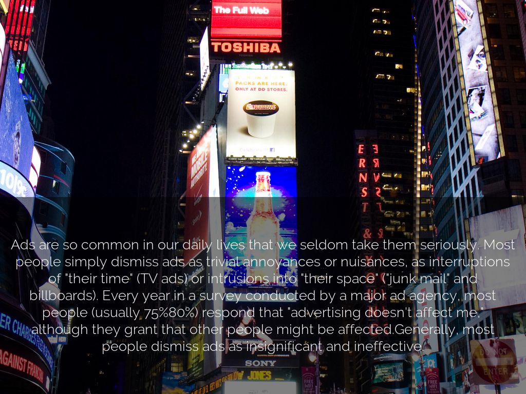 Ads are so common in our daily lives that we seldom take them seriously. Most people simply dismiss ads as trivial annoyances or nuisances, as interruptions of "their time" (TV ads) or intrusions into "their space" ("junk mail" and billboards). Every year in a survey conducted by a major ad agency, most people (usually 75%80%) respond that "advertising doesn't affect me," although they grant that other people might be affected.Generally, most people dismiss ads as insignificant and ineffective.