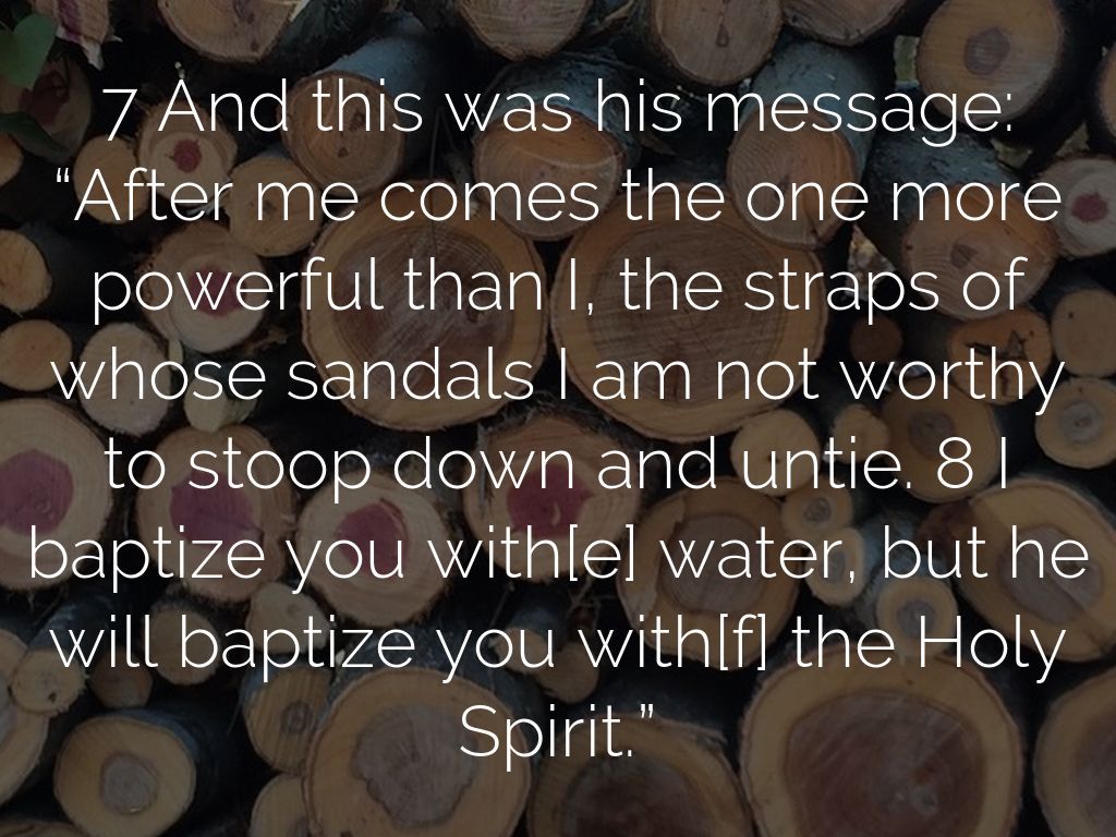 7 And this was his message: “After me comes the one more powerful than I, the straps of whose sandals I am not worthy to stoop down and untie. 8 I baptize you with[e] water, but he will baptize you with[f] the Holy Spirit.”