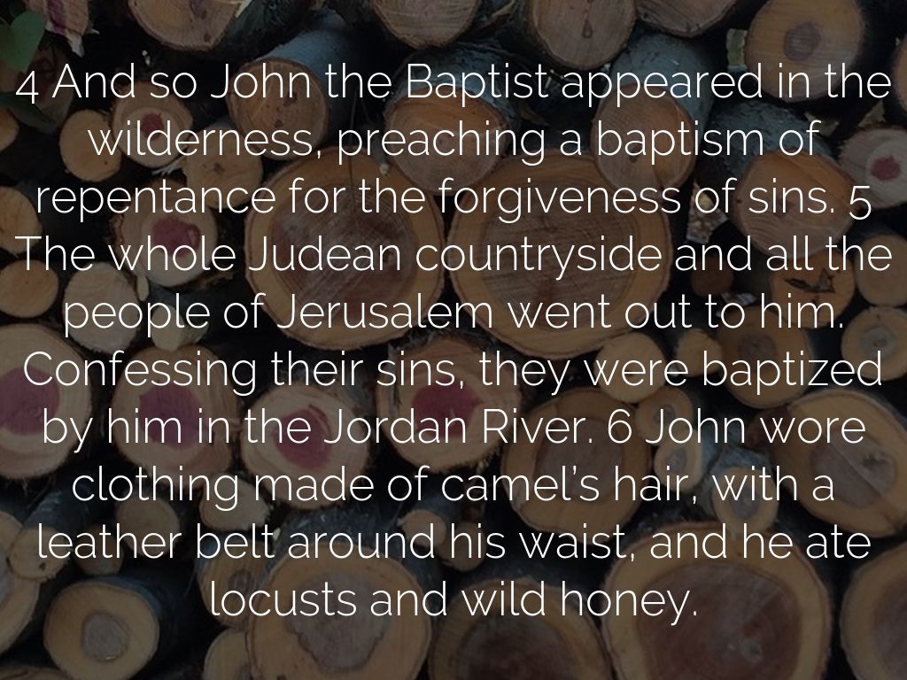 4 And so John the Baptist appeared in the wilderness, preaching a baptism of repentance for the forgiveness of sins. 5 The whole Judean countryside and all the people of Jerusalem went out to him. Confessing their sins, they were baptized by him in the Jordan River. 6 John wore clothing made of camel’s hair, with a leather belt around his waist, and he ate locusts and wild honey.