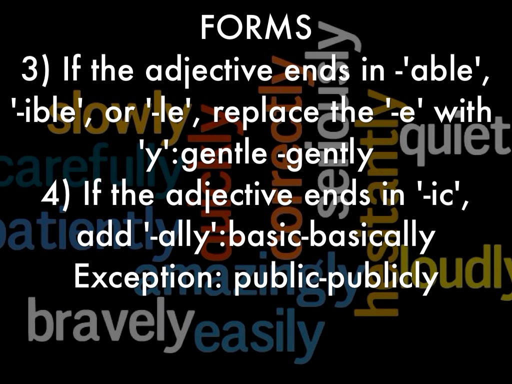 3) If the adjective ends in -'able', '-ible', or '-le', replace the '-e' with 'y':gentle -gently
