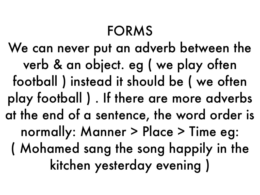 We can never put an adverb between the verb & an object. eg ( we play often football ) instead it should be ( we often play football ) . If there are more adverbs at the end of a sentence, the word order is normally: Manner > Place > Time eg: ( Mohamed sang the song happily in the kitchen yesterday evening )