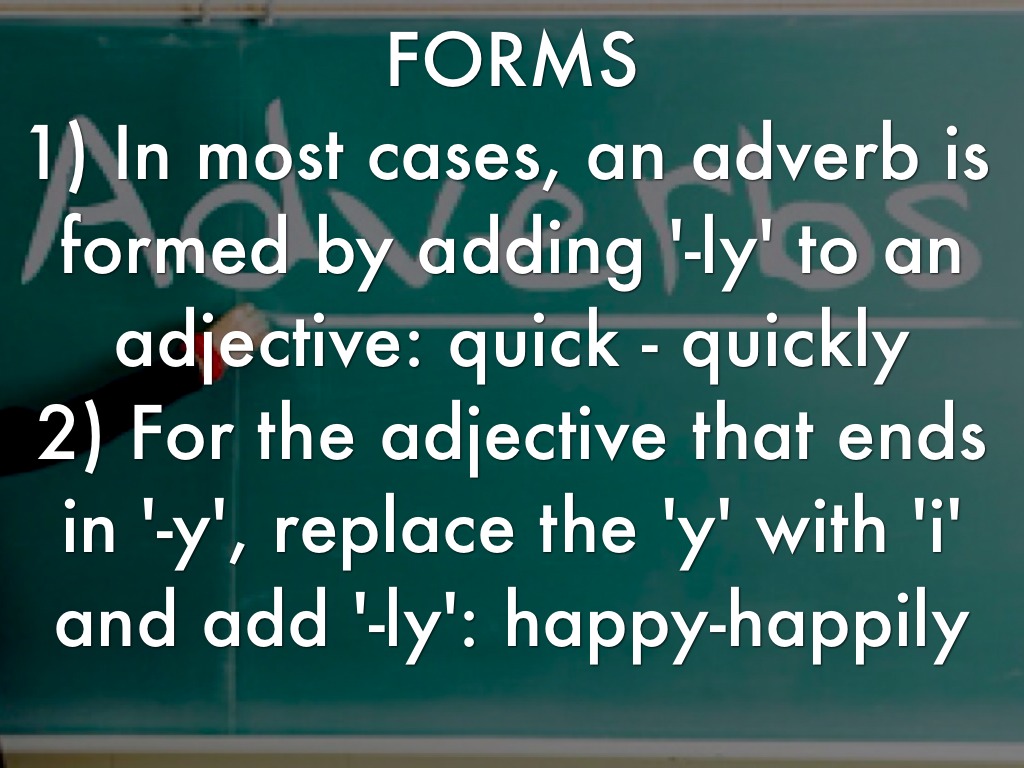 1) In most cases, an adverb is formed by adding '-ly' to an adjective: quick - quickly