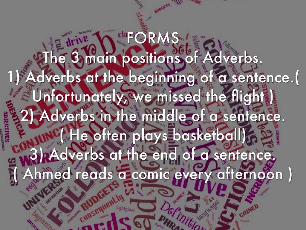 3) Adverbs at the end of a sentence. ( Ahmed reads a comic every afternoon )