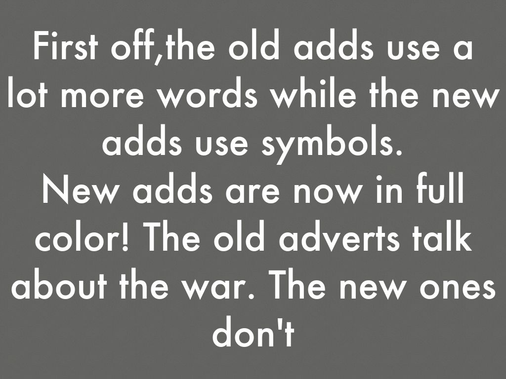 New adds are now in full color! The old adverts talk about the war. The new ones don't
