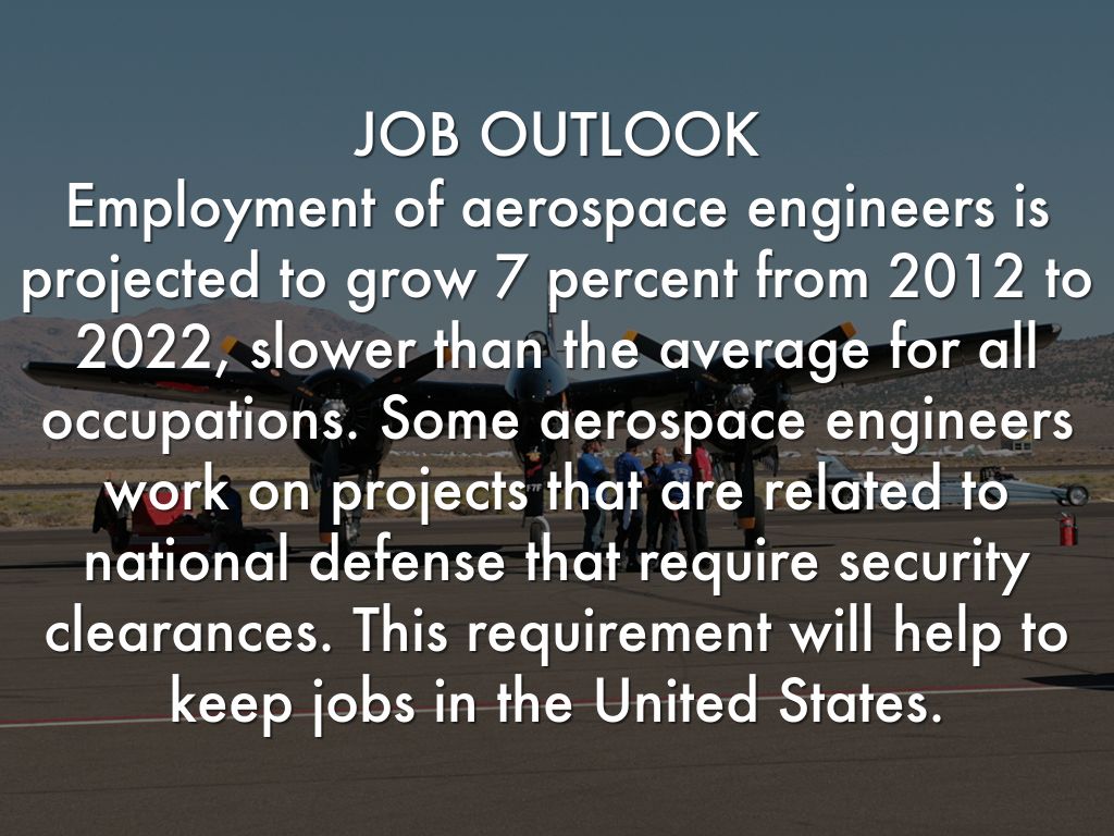 Employment of aerospace engineers is projected to grow 7 percent from 2012 to 2022, slower than the average for all occupations. Some aerospace engineers work on projects that are related to national defense that require security clearances. This requirement will help to keep jobs in the United States.