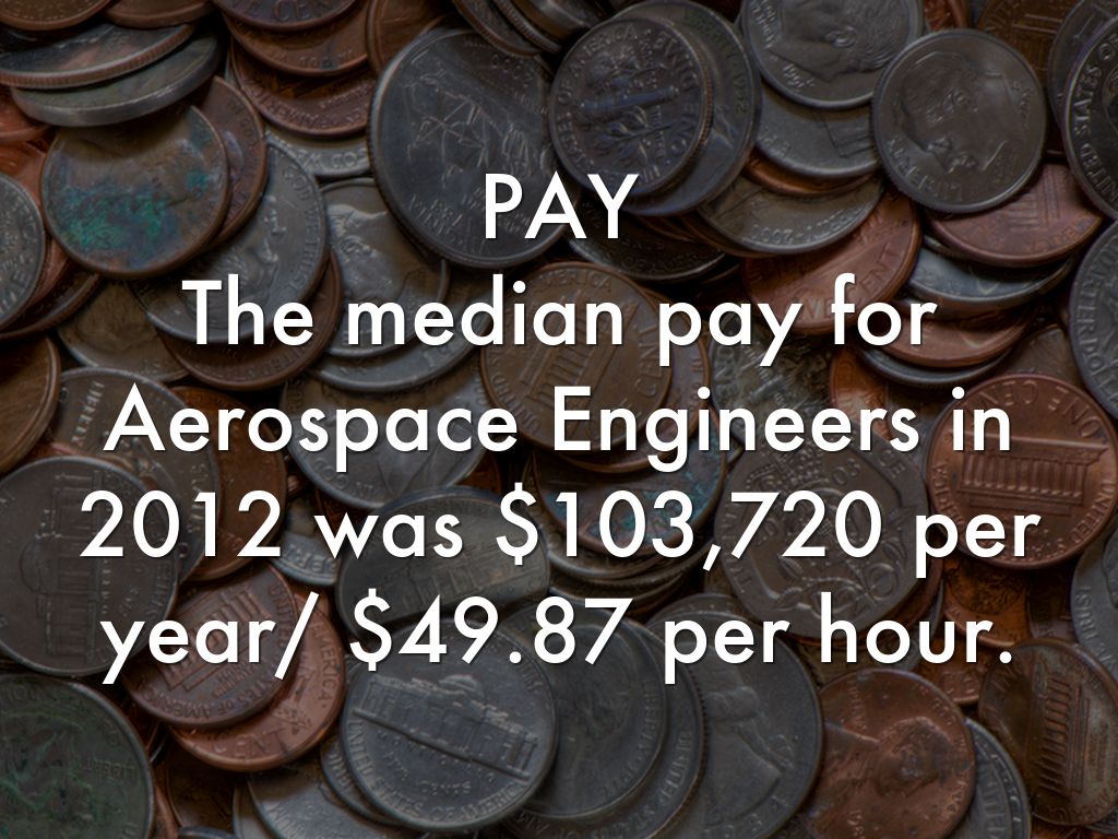 The median pay for Aerospace Engineers in 2012 was $103,720 per year/ $49.87 per hour.