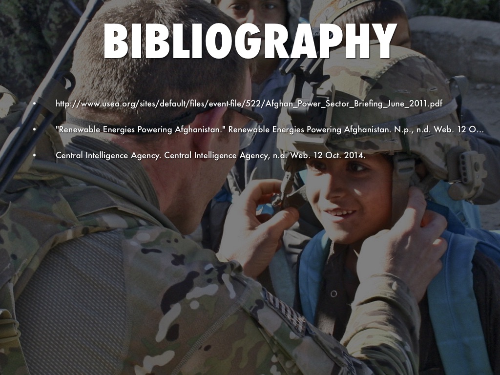 "Renewable Energies Powering Afghanistan." Renewable Energies Powering Afghanistan. N.p., n.d. Web. 12 Oct. 2014.