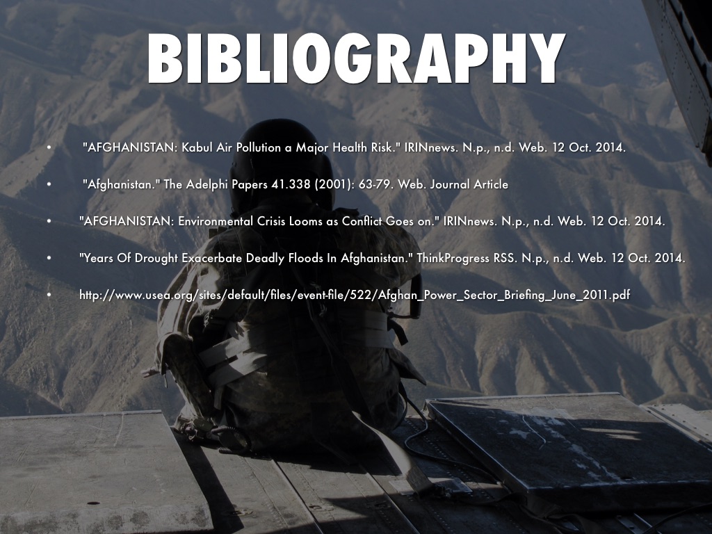 "AFGHANISTAN: Environmental Crisis Looms as Conflict Goes on." IRINnews. N.p., n.d. Web. 12 Oct. 2014.