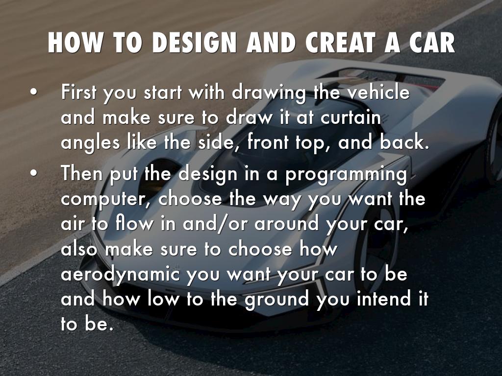 Then put the design in a programming computer, choose the way you want the air to flow in and/or around your car, also make sure to choose how aerodynamic you want your car to be and how low to the ground you intend it to be.