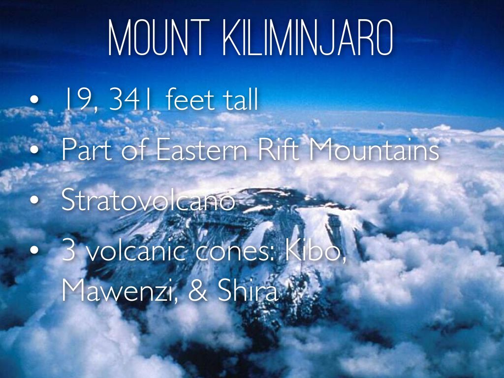 • 3 volcanic cones: Kibo, Mawenzi, & Shira