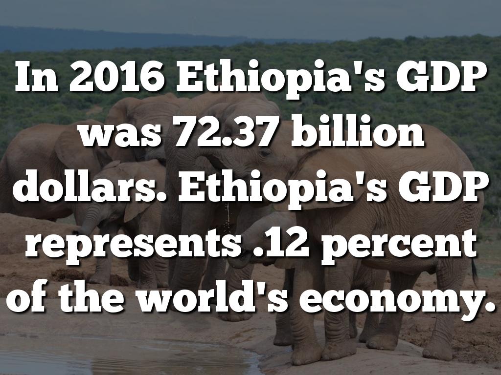 In 2016 Ethiopia's GDP was 72.37 billion dollars. Ethiopia's GDP represents .12 percent of the world's economy.