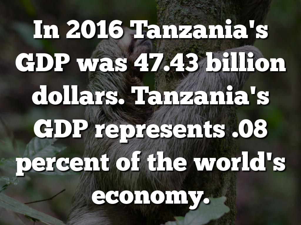 In 2016 Tanzania's GDP was 47.43 billion dollars. Tanzania's GDP represents .08 percent of the world's economy.