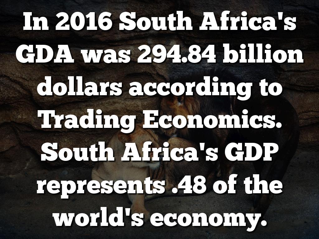 In 2016 South Africa's GDA was 294.84 billion dollars according to Trading Economics. South Africa's GDP represents .48 of the world's economy.