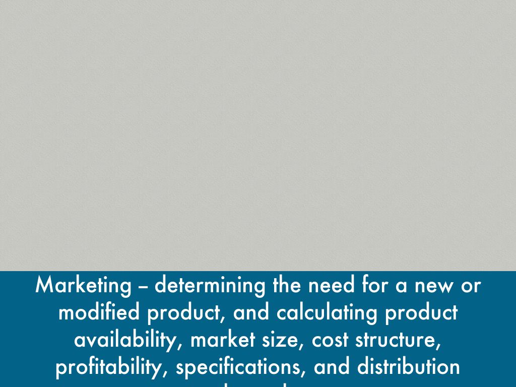 Marketing -- determining the need for a new or modified product, and calculating product availability, market size, cost structure, profitability, specifications, and distribution channels.