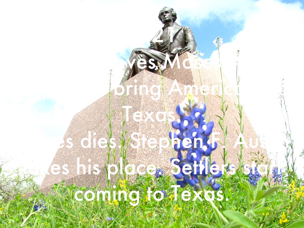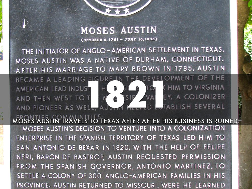 1825 Stephen F. Austin largely completes his contract to bring 300 families to Texas. A new state colonization law allows foreigners to settle in Texas. Green DeWitt receives permission to bring 400 families to Texas.
