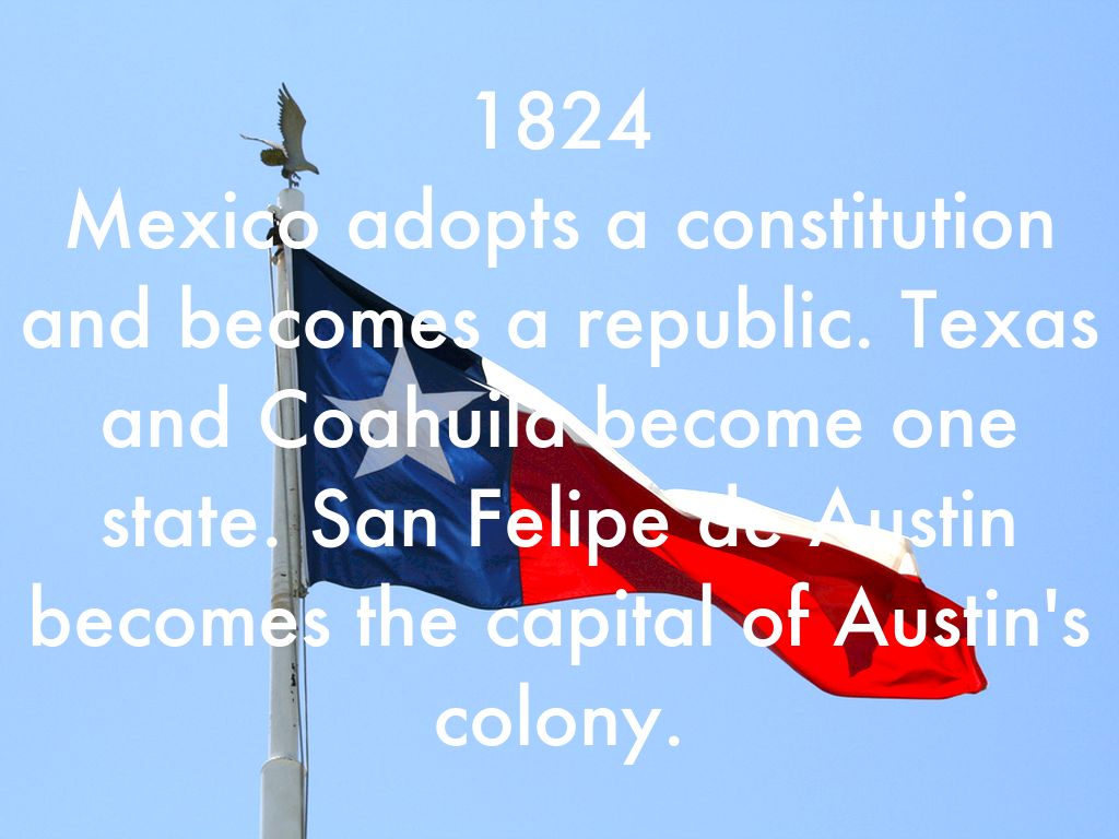 1824 Mexico adopts a constitution and becomes a republic. Texas and Coahuila become one state. San Felipe de Austin becomes the capital of Austin's colony.
