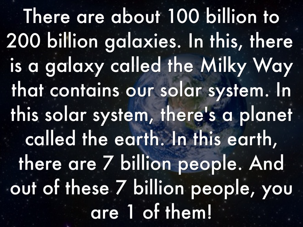 There are about 100 billion to 200 billion galaxies. In this, there is a galaxy called the Milky Way that contains our solar system. In this solar system, there's a planet called the earth. In this earth, there are 7 billion people. And out of these 7 billion people, you are 1 of them!