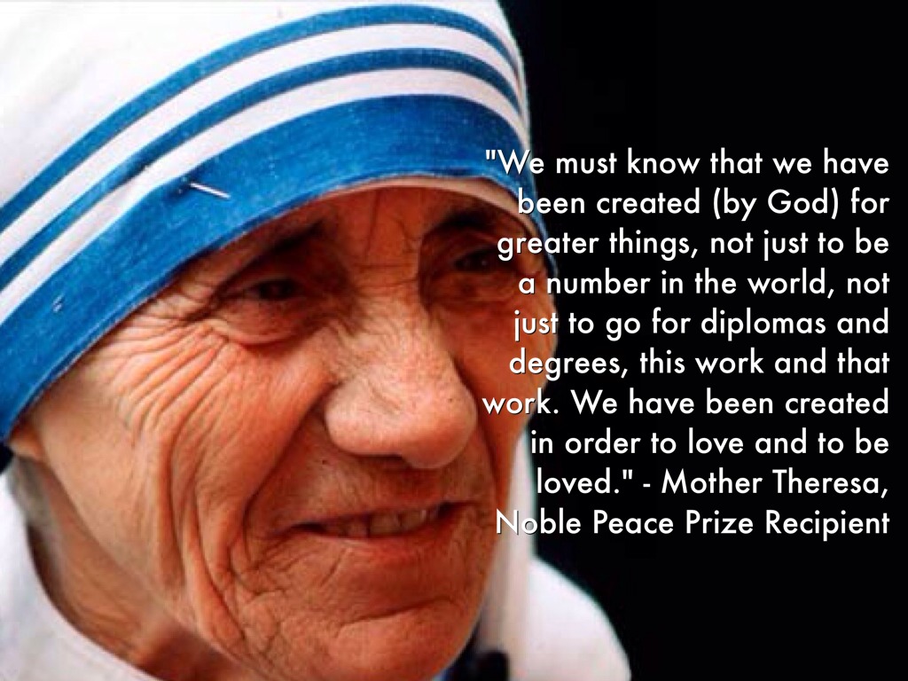 "We must know that we have been created (by God) for greater things, not just to be a number in the world, not just to go for diplomas and degrees, this work and that work. We have been created in order to love and to be loved." - Mother Theresa, Noble Peace Prize Recipient