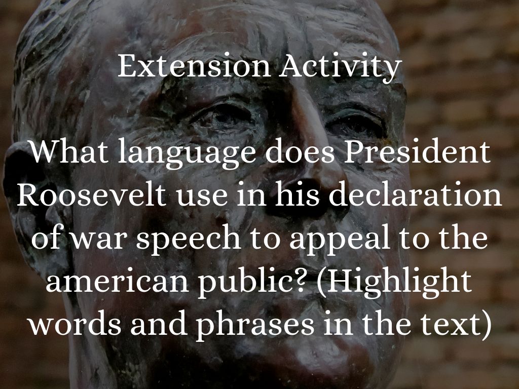 What language does President Roosevelt use in his declaration of war speech to appeal to the american public? (Highlight words and phrases in the text)