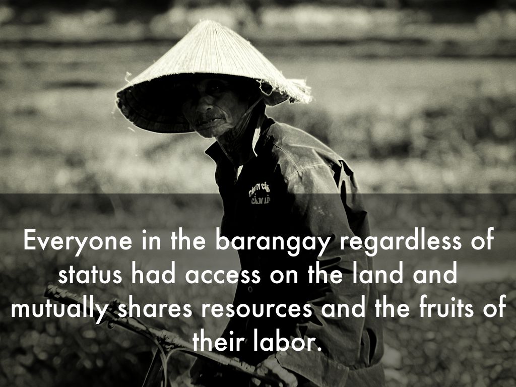 Everyone in the barangay regardless of status had access on the land and mutually shares resources and the fruits of their labor.